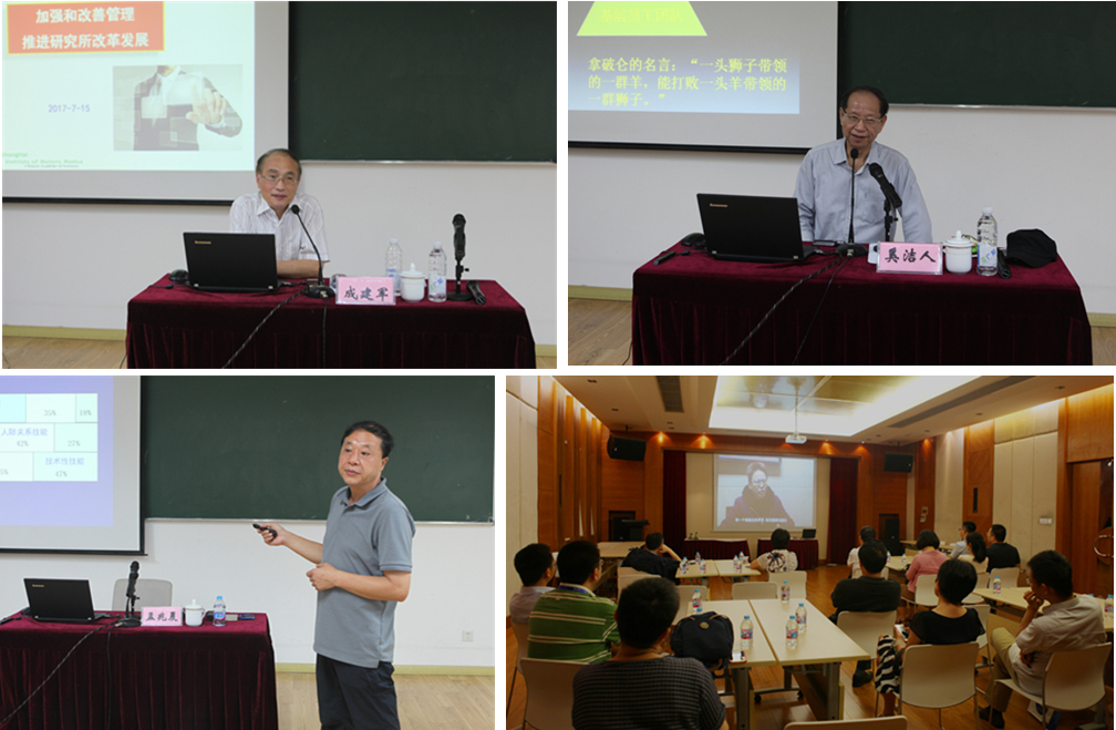 上海分院院長、上海高等研究院黨委書記、上海科技大學黨委書記朱志遠,中國浦東干部學院原常務副院長奚潔人,中科院上海藥物研究所原黨委書記成建軍,上海科技管理干部學院副教授孟兆晨受邀分別做了《上海科創中心建設的發展機遇與挑戰》、《領導力的建設與提升》、《加強和改善管理 推進研究所改革發展》、《管理理論與藝術》等主題報告。