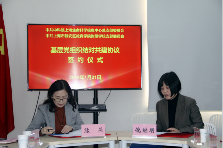 喜氣洋洋辭舊歲,滿懷憧憬迎新年。在慶祝改革開放40周年和喜迎新中國成立70周年之際,中科院上海生命科學信息中心黨總支與靜安區教育學院附屬學校黨支部黨建結對簽約儀式于1月21日上午在岳陽路319號黨支部組織生活開放點舉行,這是雙方以實際行動貫徹習近平新時代中國特色社會主義思想的具體體現,是科研院所與基礎教育攜手共促黨建工作的有益嘗試。靜安區教育學院附屬學校黨支部書記倪繼明、校工會主席兼黨組織委員李明琍、校長助理兼教導主任逯懷海,信息中心黨總支書記熊燕、副主任繆有剛等領導出席活動。