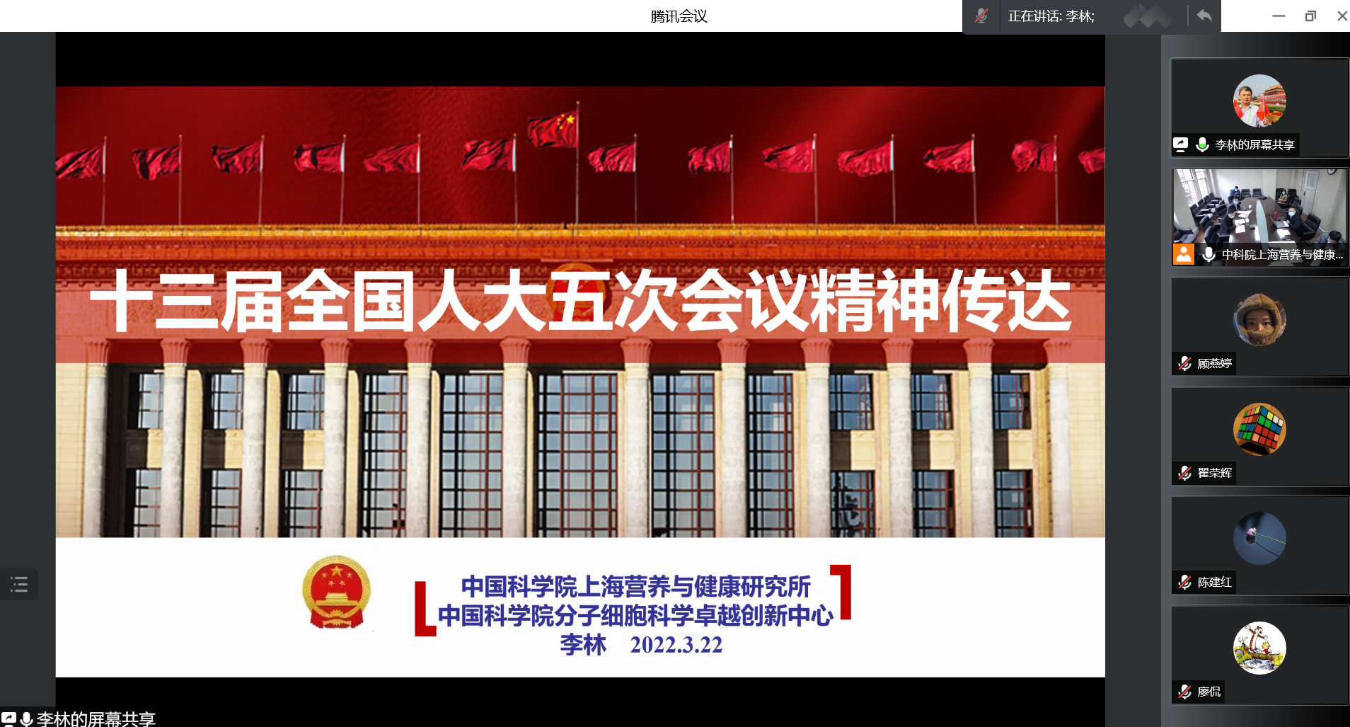 3月22日,中科院上海營養與健康研究所組織召開2022年度黨委理論中心組第四次專題學習,傳達學習全國“兩會”精神。研究所黨委書記、副所長瞿榮輝主持學習會,領導班子成員、黨委委員、所務委員、職能部門負責人通過線上線下方式參加學習。