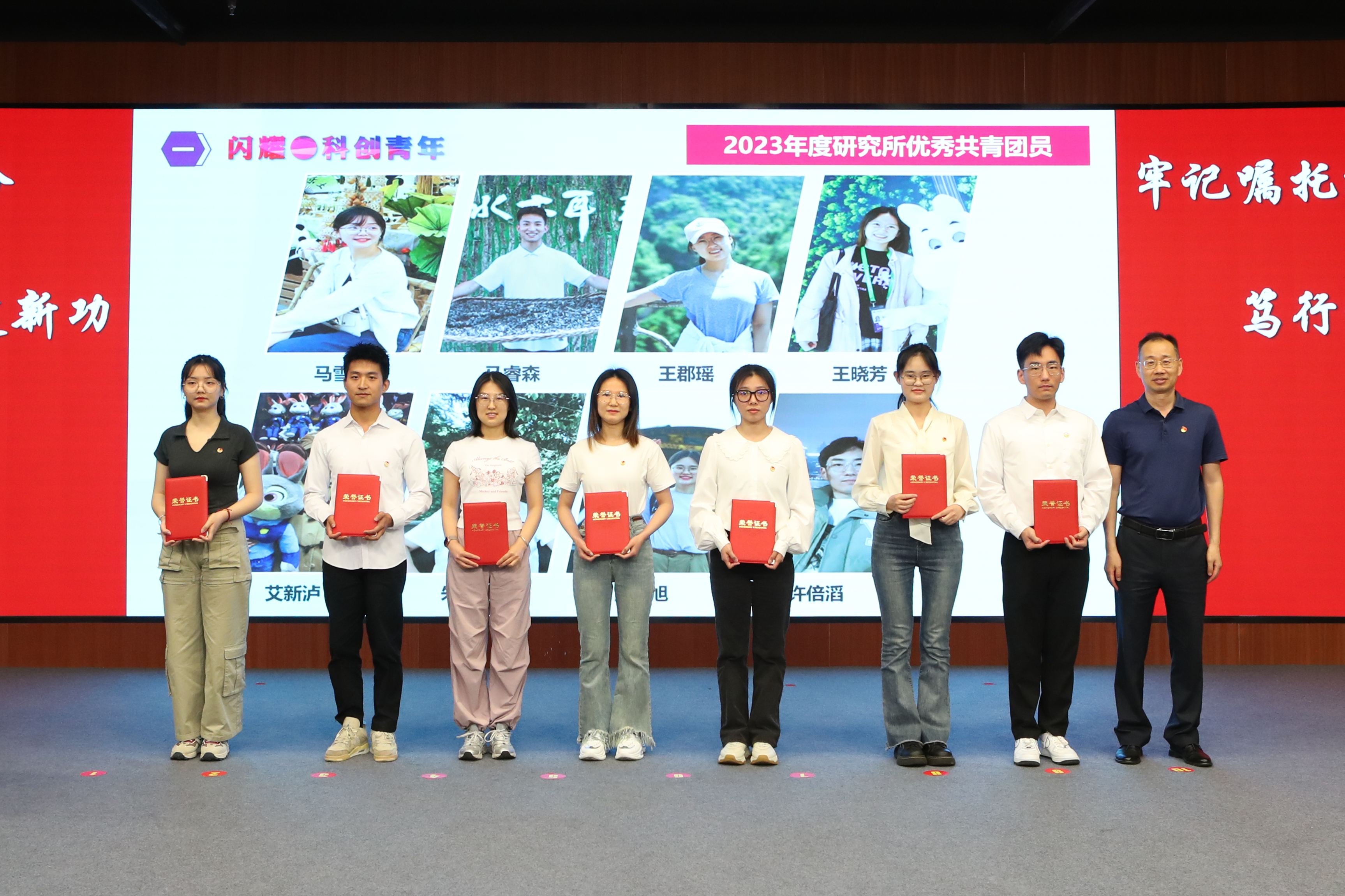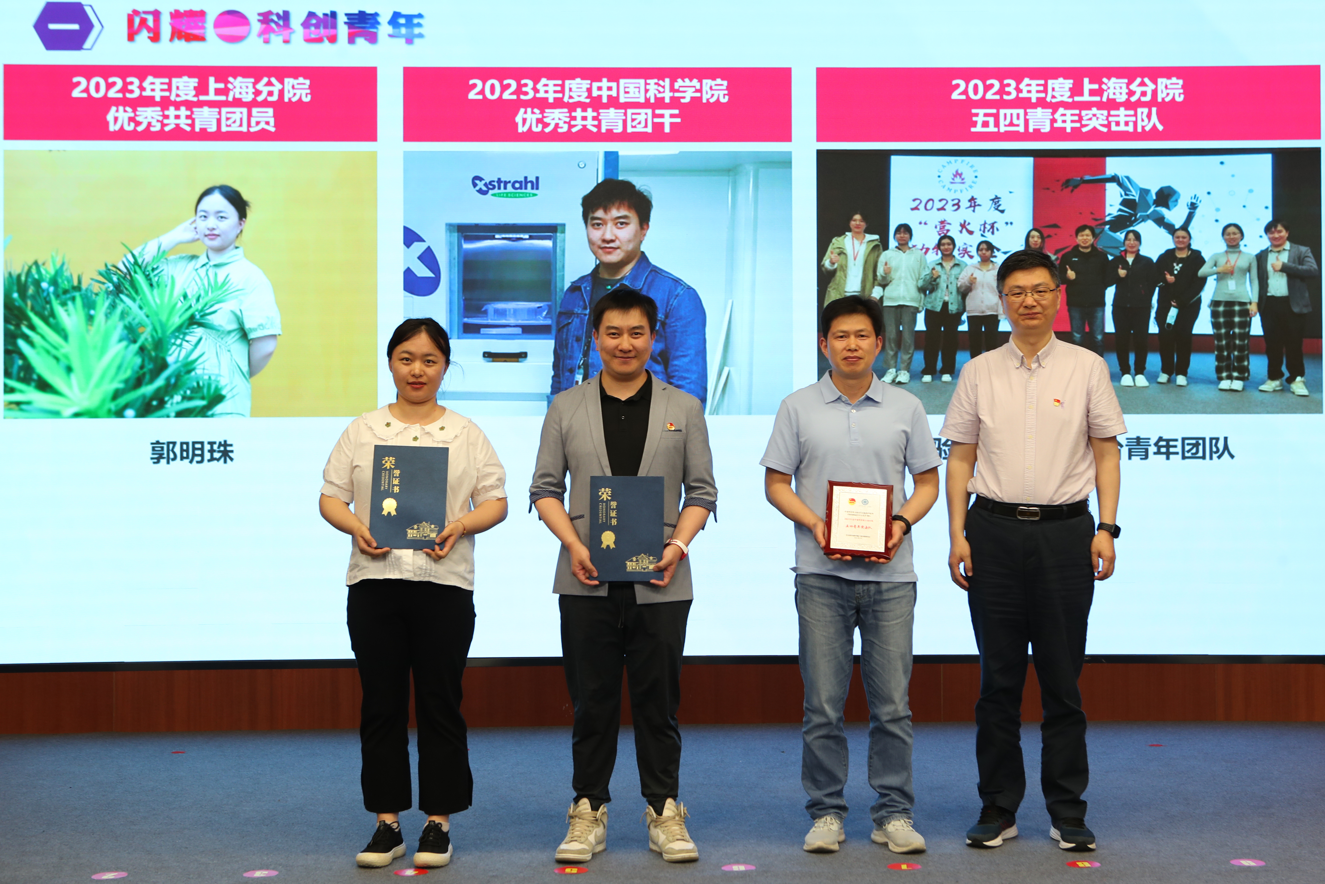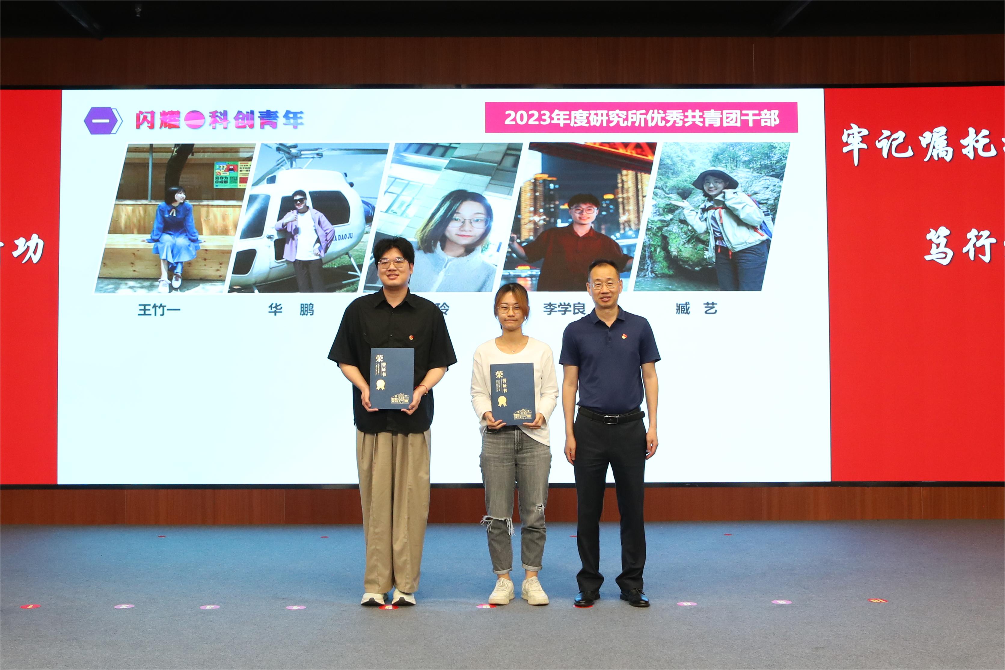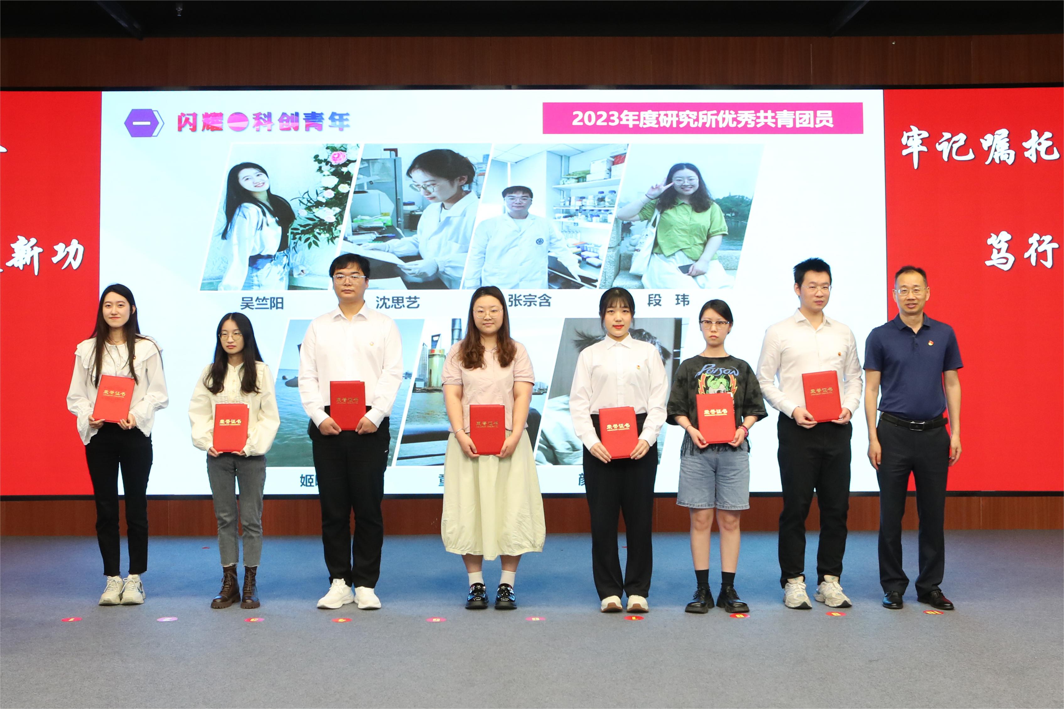 瞿榮輝為獲得“中國科學(xué)院優(yōu)秀共青團(tuán)干部”、“中國科學(xué)院上海分院優(yōu)秀共青團(tuán)員”、“中國科學(xué)院上海分院五四青年突擊隊(duì)”稱號(hào)的青年代表頒獎(jiǎng)。朱泰來為獲得上海分院“中銀·科苑優(yōu)秀學(xué)子”稱號(hào)的青年代表頒獎(jiǎng)。曹永為獲得研究所2023年度優(yōu)秀團(tuán)員、團(tuán)干的青年們頒獎(jiǎng)。優(yōu)秀青年郭明珠作為代表發(fā)言。