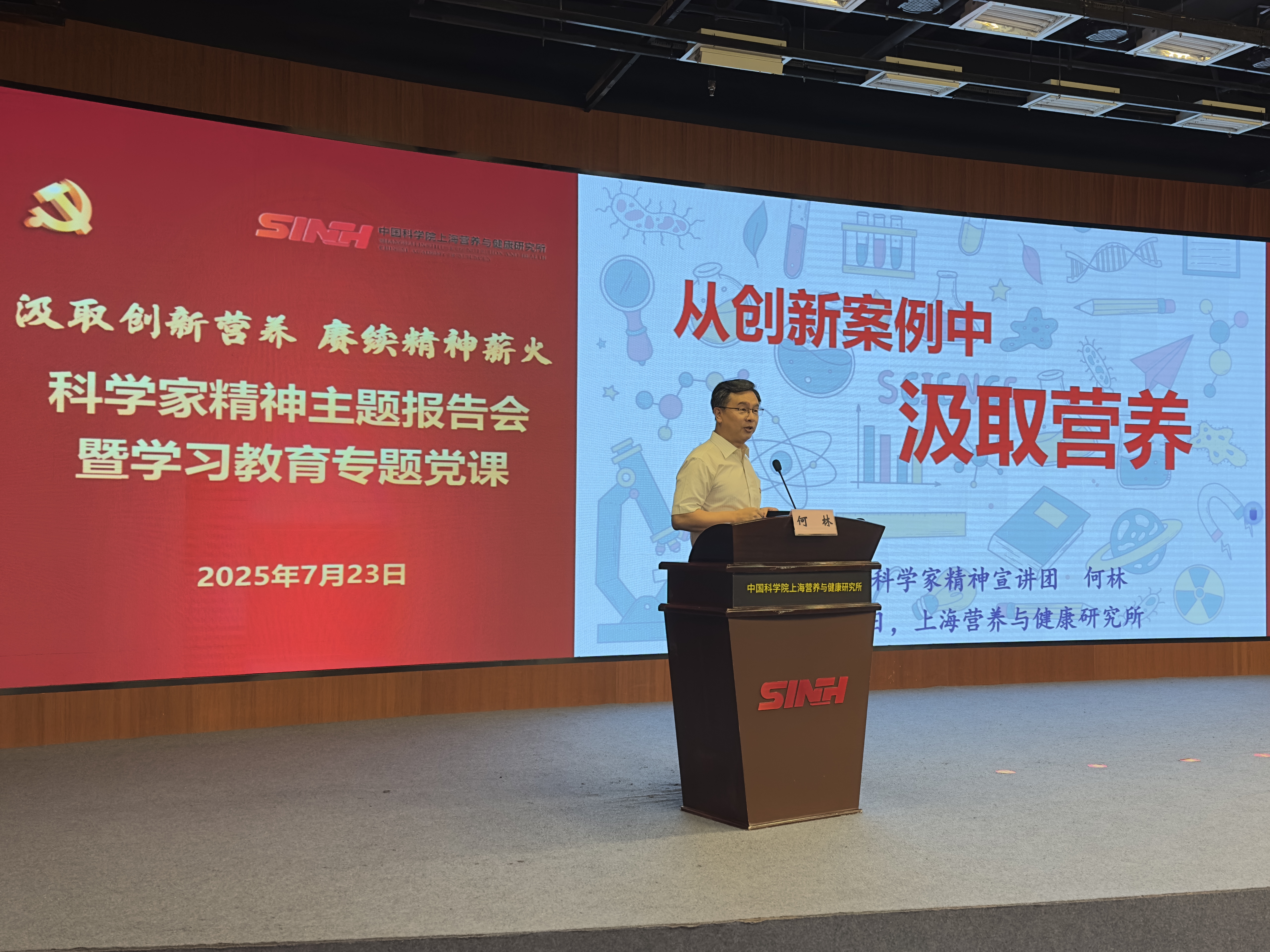 7月23日,中國科學院上海營養與健康研究所舉辦“汲取創新營養 賡續精神薪火”科學家精神主題報告會暨學習教育專題黨課,特邀中國科學院科學家精神宣講團成員何林作專題報告。研究所各黨(總)支部書記、職能部門負責人、科研骨干及青年代表等百余人參加學習,黨委書記瞿榮輝主持報告會。