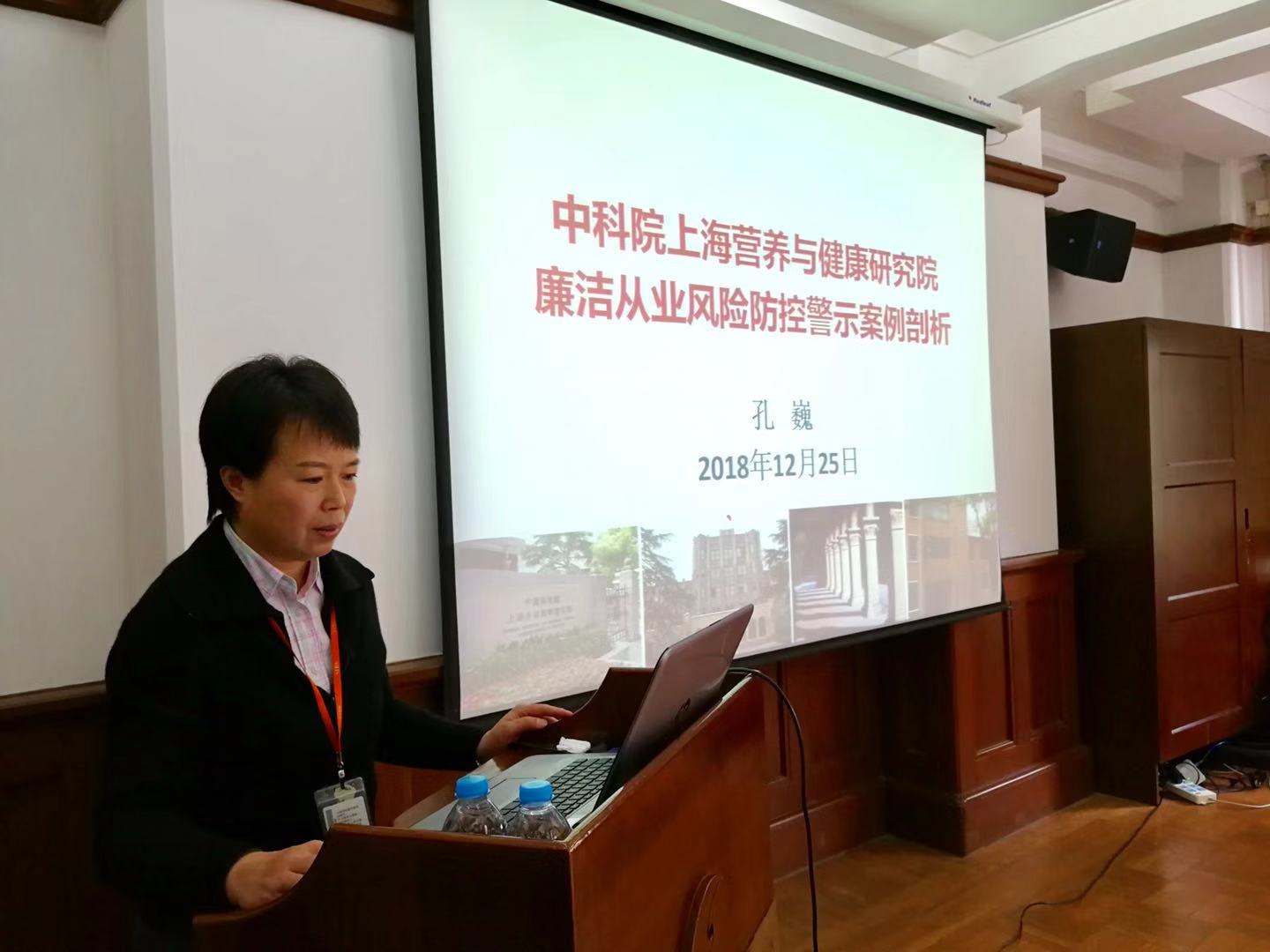 2018年12月25日,上海營養與健康研究院召開廉潔從業風險防控警示教育會議。上海生科院黨委書記蔡澎、紀委書記孔巍,各職能管理部門負責人、平臺負責人、研究組秘書等近70位同志參加會議。會議由聯合辦公室主任孫迪主持。