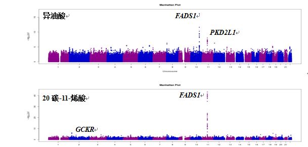 圖1: 單不飽和脂肪酸水平的全基因組關(guān)聯(lián)分析曼哈頓圖?