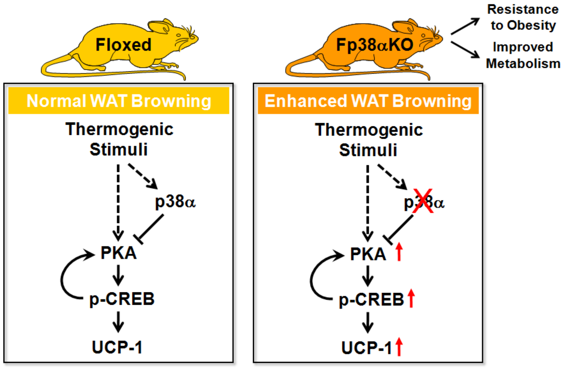 在這項(xiàng)最新的研究中,博士研究生張圣潔等人在應(yīng)浩研究員的指導(dǎo)下,發(fā)現(xiàn)脂肪組織特異敲除p38α后小鼠的體重減輕,但是體溫維持能力以及褐色脂肪產(chǎn)熱功能基本不受影響。而在低溫環(huán)境下,白色脂肪p38α缺失后能夠觀察到米色脂肪細(xì)胞比對(duì)照明顯增多,米色化活動(dòng)加劇。在β腎上腺素受體激動(dòng)劑CL316,243的刺激下,脂肪組織p38α缺失的小鼠能量消耗顯著增加。通過基因敲除小鼠和抑制劑定點(diǎn)注射兩種手段,發(fā)現(xiàn)p38α缺失或活性受損后能夠抵抗高脂飲食誘導(dǎo)的肥胖以及db/db小鼠體重的上升。通過一系列體外水平實(shí)驗(yàn),發(fā)現(xiàn)p38α缺失后在白色脂肪細(xì)胞中PKA以及CREB的活性同時(shí)上調(diào),促進(jìn)UCP1的轉(zhuǎn)錄表達(dá),細(xì)胞的米色化進(jìn)程加快,能量消耗增加。