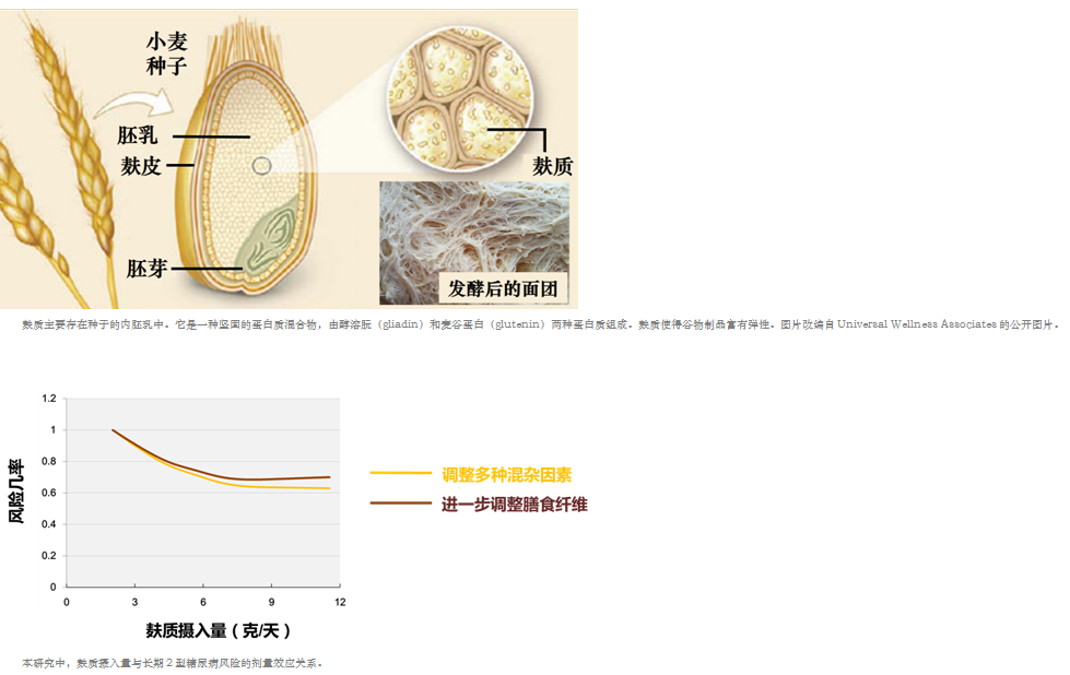 麩質(zhì)是小麥、大麥和黑麥胚乳中的主要貯藏蛋白。中國人日常飲食中,所吃的“面筋”就是面粉經(jīng)過反復(fù)水洗后剩余的麩質(zhì)。在全世界范圍內(nèi),有少量人(約1%)對麩質(zhì)過敏,導(dǎo)致自身免疫反應(yīng)并引起乳糜瀉。在過去的幾年中,“無麩質(zhì)飲食”在許多國家越來越受歡迎。大眾普遍認(rèn)為攝入無麩質(zhì)飲食有益于健康,特別是對控制體重有好處。但是這種觀點缺乏關(guān)于麩質(zhì)攝入對人群健康影響的證據(jù)。一些小型干預(yù)研究報道高劑量的麩質(zhì)攝入(60-100 g/day)對健康個體和血脂異常人群無明顯副作用,而每天攝入60-80g麩質(zhì)可降低血脂、血壓,減少氧化應(yīng)激。為了研究麩質(zhì)攝入對健康的潛在影響,本研究檢驗了人群中典型麩質(zhì)攝入量(2-12g/day)與2型糖尿病之間的關(guān)系。