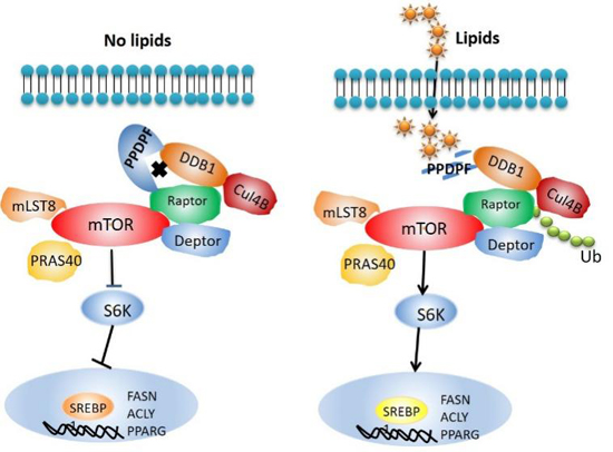研究人員發(fā)現(xiàn)肝臟特異性敲除PPDPF的小鼠正常飼養(yǎng)32周后自發(fā)形成脂肪肝,而高脂飲食(HFD)可以加速脂肪肝的發(fā)生和發(fā)展。機(jī)制研究表明,PPDPF通過(guò)干擾Raptor和CUL4B-DDB1之間的相互作用,阻止Raptor的泛素化和活化,進(jìn)而負(fù)調(diào)控mTORC1-S6K-SREBP1信號(hào),減少脂質(zhì)合成,抑制脂肪肝發(fā)生發(fā)展。在野生型小鼠的肝臟中特異性過(guò)表達(dá)PPDPF有效抑制了mTORC1信號(hào)通路的激活和肝臟的脂肪變性。這些結(jié)果表明,PPDPF是mTORC1在脂代謝中的新型調(diào)節(jié)因子,并為非酒精性脂肪肝病提供了治療候選靶點(diǎn)。