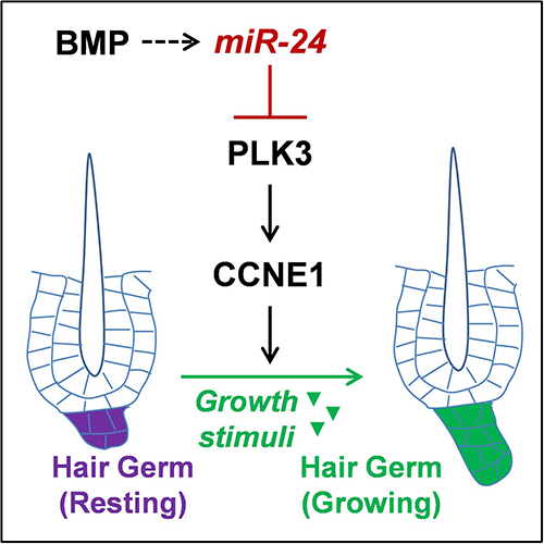 研究人員發(fā)現(xiàn),在毛囊由靜止到激活轉(zhuǎn)變過程中,即將激活的毛囊前體細(xì)胞顯著下調(diào)了一個(gè)miRNA,miR-24。通過構(gòu)建和分析miR-24的皮膚上皮特異性誘導(dǎo)過表達(dá)和條件性敲除小鼠模型,研究人員發(fā)現(xiàn)miR-24的作用是限制毛囊前體細(xì)胞對(duì)生長刺激的敏感性。miR-24在皮膚上皮組織中的過表達(dá)顯著延緩了毛囊前體細(xì)胞的激活與毛發(fā)周期推進(jìn),而它在皮膚上皮組織中的條件性敲除顯著加速了毛發(fā)周期,并提高了毛囊對(duì)毛發(fā)再生刺激的敏感性。值得一提的是,miR-24的皮膚條件性敲除能夠顯著提高米諾地爾(minoxidil)生發(fā)水的生發(fā)效果,且無可見副作用,提示miR-24具有作為新型生發(fā)治療靶點(diǎn)的潛力。從機(jī)制上講,研究人員發(fā)現(xiàn)Plk3是一個(gè)新的miR-24的靶基因,它通過調(diào)控參與細(xì)胞周期的關(guān)鍵蛋白CCNE1在miR-24的激活限制功能中發(fā)揮主要作用。此外,研究人員還發(fā)現(xiàn),miR-24作用于已知的毛發(fā)生長抑制信號(hào)BMP的下游。