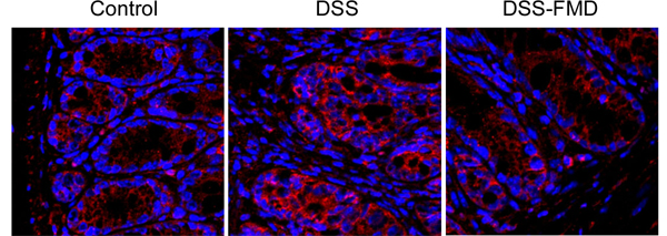 圖注:圖為結腸切片的炎癥小體NLRP3的免疫熒光染色,紅色為NLRP3陽性細胞,藍色為細胞核。DSS誘導的腸炎中炎癥小體明顯增加,而間歇性模擬禁食干預(FMD)可以顯著減少炎癥小體。