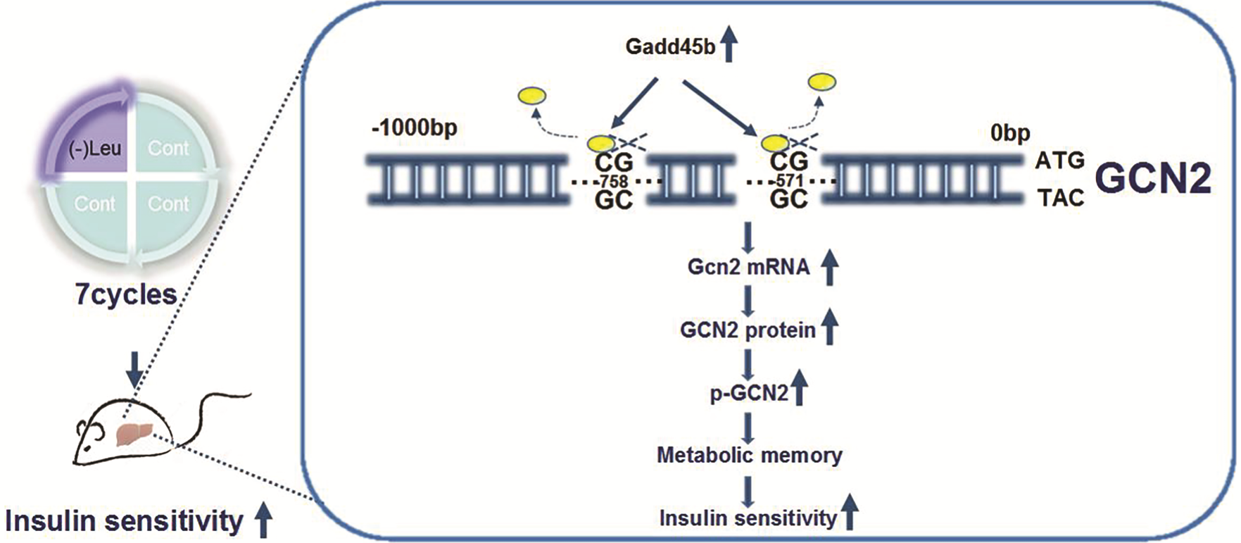 研究團隊發現短期(1天)亮氨酸缺乏提高小鼠胰島素的效應可持續3天。受間歇性禁食對代謝的有益作用啟發,給予小鼠間歇性亮氨酸缺乏(1天缺乏飲食+3天對照飲食)處理,發現經過7次間歇性亮氨酸缺乏處理后,即使恢復正常飲食,其對小鼠的胰島素敏感性提高作用可通過形成代謝記憶依然至少維持近3個月。更為重要的是,間歇性亮氨酸處理也持久地改善了不同模型中的胰島素抵抗現象。進一步研究發現,間歇性亮氨酸缺乏是通過增加肝臟GCN2表達發揮作用;而GCN2的表達是通過上調去甲基化酶Gadd45b來作用于其啟動子的甲基化位點、進而影響甲基化水平來實現的。