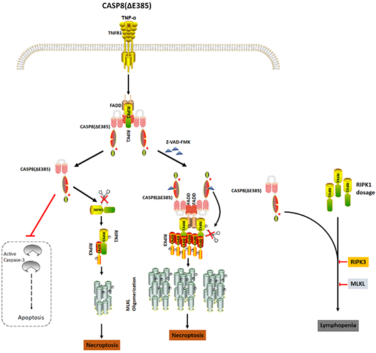 圖:Caspase-8蛋白通過自我剪切調控細胞死亡及促進免疫缺陷疾病的作用模式圖