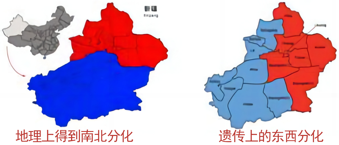 圖1.維吾爾族人群在地理上的南北分布以及在遺傳上的東西分化