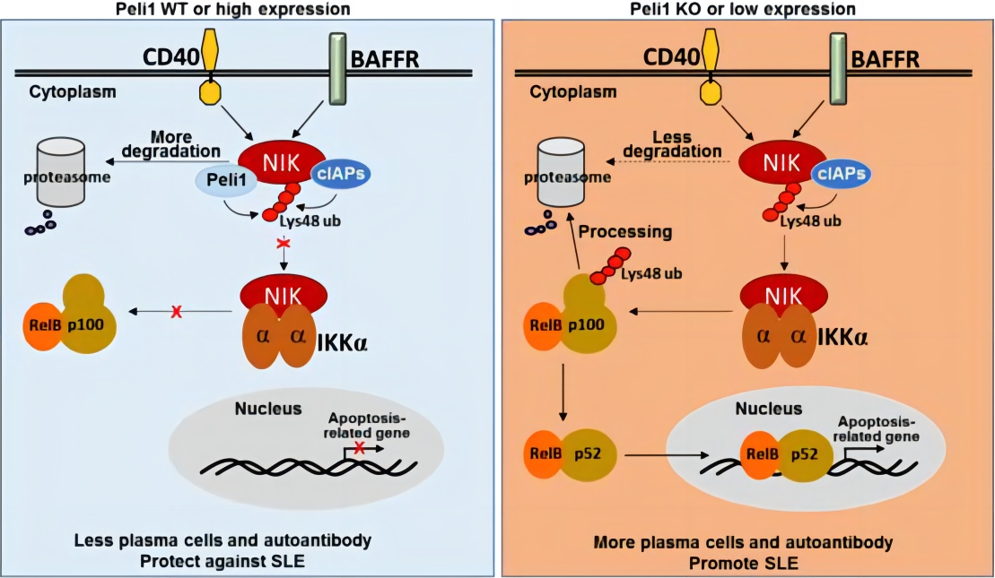 在本研究中,博士研究生劉俊利等在肖意傳研究員指導下,分別利用遺傳小鼠模型和臨床患者數據驗證,揭示Peli1可通過負調節非經典NF-κB信號通路以抑制B細胞的自身抗體的產生,以及系統性紅斑狼瘡的發病。在遺傳小鼠模型中,Peli1在B細胞中缺失后可顯著促進B細胞的活化與抗體的產生,此外,Peli1缺失后會促進小鼠SLE的病理指征,包括更多的IgG在腎小球的沉積,以及血清中檢測到更多的抗核抗體和抗自身抗體。進一步的分子機制研究發現,Peli1是非經典NF-κB信號通路關鍵蛋白激酶NIK的特異性的E3泛素連接酶,并介導了NIK的K48連接的多聚泛素化與降解作用,因此,當Peli1缺失后,B細胞中NIK會大量積累,并持續活化非經典NF-κB信號通路,進而促進了B細胞的活化與自身抗體的產生。與之相應,在臨床SLE患者樣本中,研究表明患者外周血單核細胞中PELI1的表達與SLE的病理評分及血清中IgG濃度等呈現負相關性,進一步證明了PELI1負調節人SLE病理的作用。?