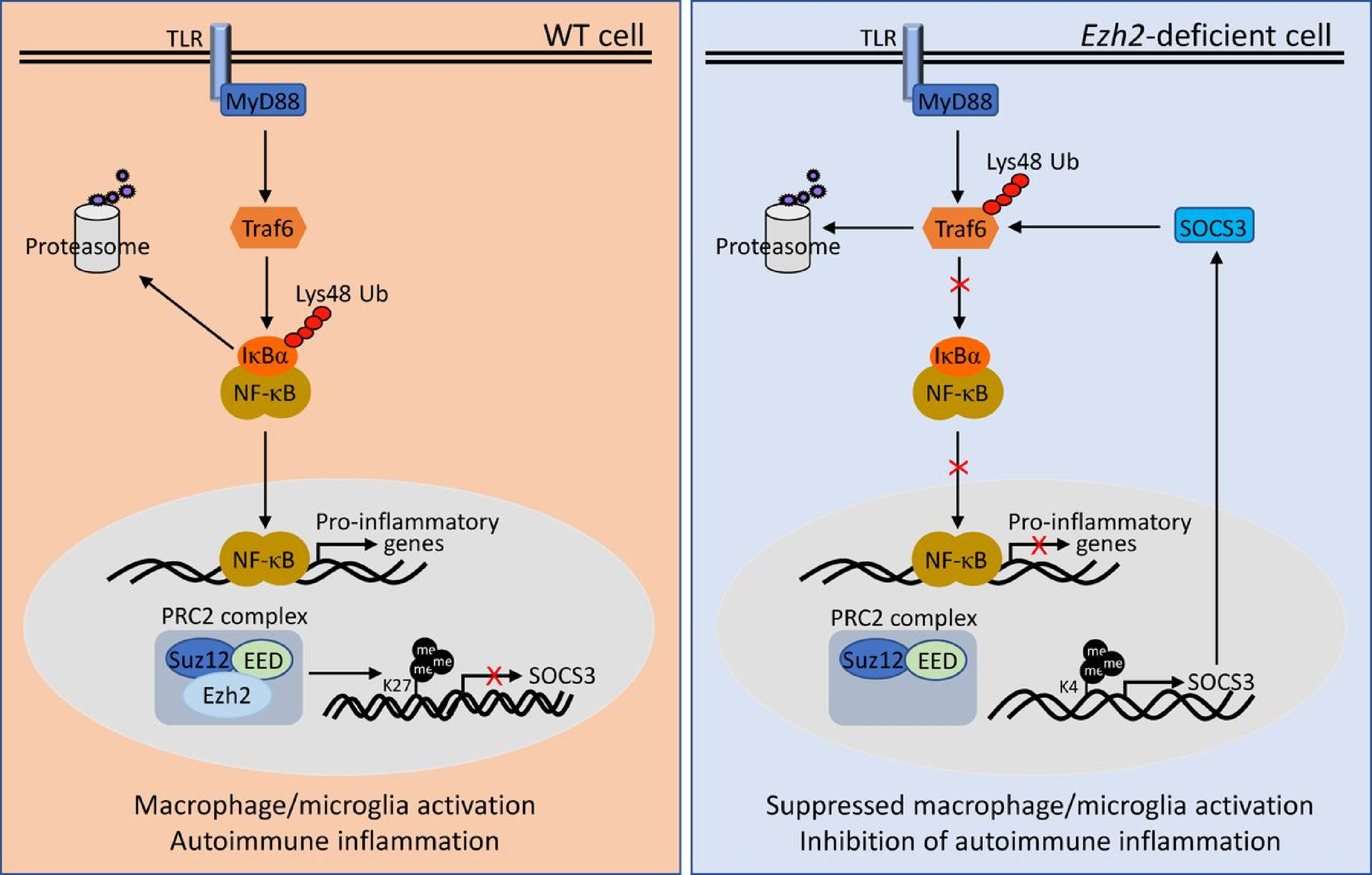在本研究中,博士研究生張興利等在肖意傳和秦駿研究員的共同指導下,利用遺傳小鼠模型揭示了Ezh2在巨噬細胞與小膠質(zhì)細胞中通過靶向抑制抗炎癥性基因Socs3的表達,進而介導了巨噬細胞與小膠質(zhì)細胞在炎癥部位的活化,由此促進了炎癥性腸炎與實驗性自身免疫性腦脊髓炎的發(fā)病。當利用Ezh2選擇性抑制劑GSK126抑制H3K27me3,或當Ezh2在髓系來源的細胞中特異性敲除后,骨髓來源的巨噬細胞與小膠質(zhì)細胞的炎癥性活化受到了顯著抑制,相應自身免疫性疾病的發(fā)病也得到了緩解。進一步分子機制研究發(fā)現(xiàn),Ezh2特異性的靶向Socs3基因的啟動子區(qū)域,促進了相關(guān)區(qū)域H3K27me3的表達,由此抑制了抗炎基因Socs3的表達。因此,?Ezh2缺失會顯著促進Socs3基因的表達,大量產(chǎn)生的Socs3又介導了Traf6的泛素化降解作用,并進一步抑制了下游NF-κB信號通路的活化與促炎癥基因的表達(下圖)。有意思的是,多發(fā)性硬化病人腦部基因表達譜數(shù)據(jù)表明,EZH2在病人腦組織中的表達相較正常人腦組織的表達有明顯升高的趨勢,提示EZH2可能介導了多發(fā)性硬化病理過程中小膠質(zhì)細胞的炎癥性活化,并參與了疾病的發(fā)生發(fā)展,因此其可作為一個潛在的自身免疫性疾病的治療靶標。