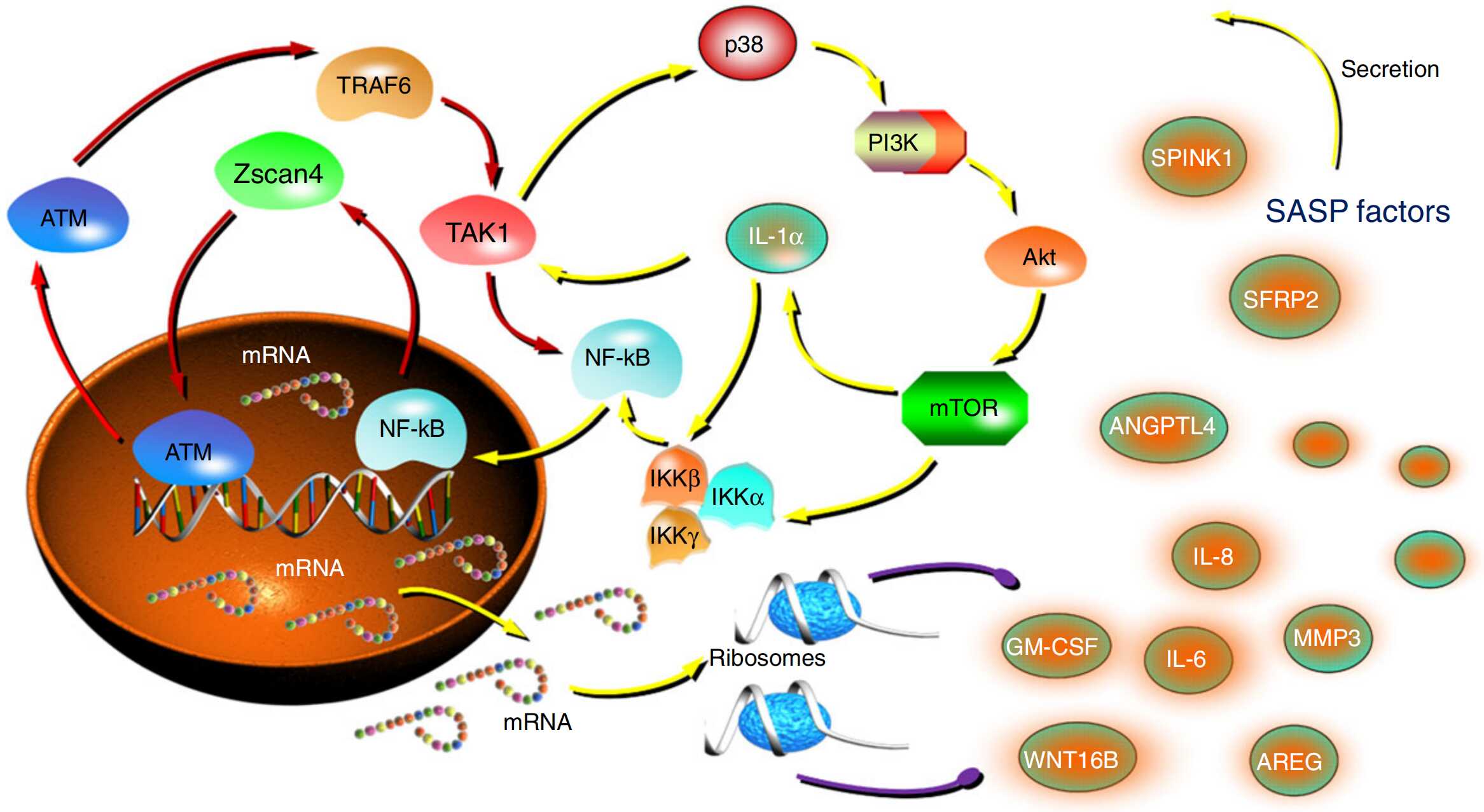4月30日,國際學術期刊Nature Communications在線發表了中國科學院上海營養與健康研究院孫宇研究組題為“The senescence-associated secretory phenotype is potentiated by feedforward regulatory mechanisms involving Zscan4 and TAK1”的最新研究成果,文章報道了由藥物毒副作用引發DNA損傷效應在臨床治療過程中引發體內細胞發生被動衰老,并在誘導衰老細胞出現一種強烈、持續和長期的分泌表型(senescence-associated secretory phenotype,?SASP,?衰老相關分泌表型)過程中的關鍵作用。