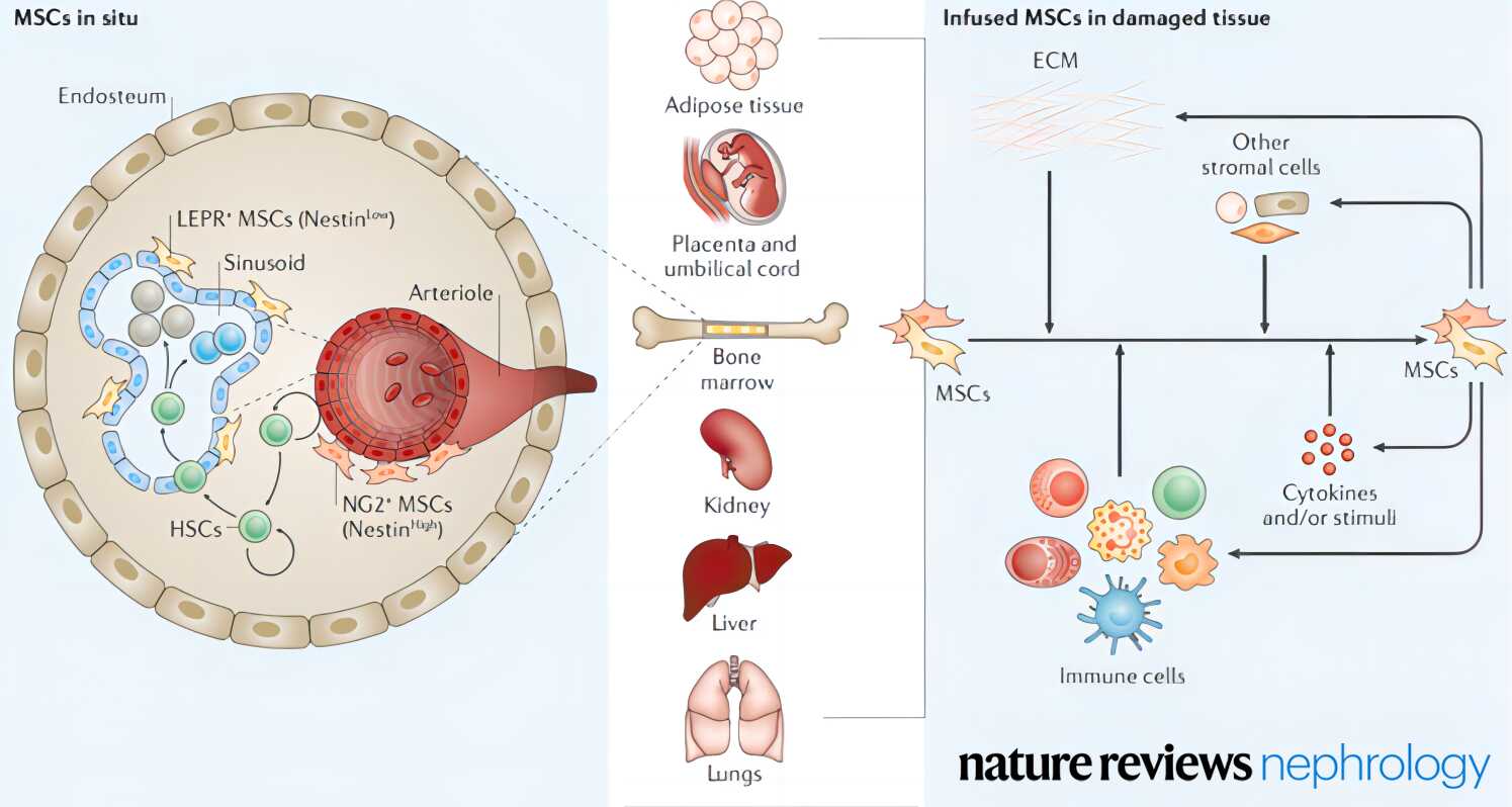 MSCs最早在骨髓中發現,作為干細胞巢的組成部分,具有調控造血干細胞自我更新、增殖和分化的能力,并具有向脂肪細胞和成骨、成軟骨細胞分化的潛能。隨后的研究表明,MSCs在臍帶、脂肪、肺臟、腎臟等多種器官中均有存在,作為基質細胞維持器官內環境穩態。MSCs能夠廣泛、活躍地與微環境中的組織細胞、干細胞、免疫細胞以及細胞外基質等組分交互作用,在生理病理條件下,調控疾病的進展和修復。MSCs移植在許多炎癥性和損傷性疾病,如移植物抗宿主反應、多發性硬化、心肌缺血等疾病中均顯示出了良好的治療效果。目前,美國國立衛生研究院ClinicalTrials.gov數據庫上登記的MSCs相關臨床實驗已經超過700例。