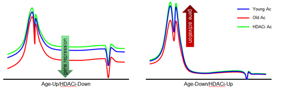 大腦的炎性衰老是衰老相關(guān)的神經(jīng)退行性疾病的一個(gè)主要標(biāo)志。研究人員通過(guò)對(duì)人和小鼠大腦中H3K27ac和基因表達(dá)數(shù)據(jù)的整合分析,發(fā)現(xiàn)隨衰老上調(diào)和下調(diào)的基因上具有完全不同的H3K27ac修飾模式。盡管H3K27ac在兩類(lèi)基因的啟動(dòng)子上均有分布,然而富集免疫相關(guān)功能并隨衰老上調(diào)的基因的基因體上卻有著更為廣泛的H3K27ac修飾,并且這些修飾會(huì)隨著衰老逐漸丟失。與啟動(dòng)子區(qū)H3K27ac的轉(zhuǎn)錄激活功能不同,基因體超乙酰化抑制了炎性衰老相關(guān)基因的過(guò)度激活,并且基因體上的H3K27ac水平,可以用來(lái)預(yù)測(cè)基因在衰老過(guò)程中的變化方向。上述研究證實(shí)了H3K27ac在隨衰老上調(diào)或下調(diào)的基因上行使截然相反的調(diào)控功能,并且提出了基因體超乙酰化抑制轉(zhuǎn)錄的新模式。