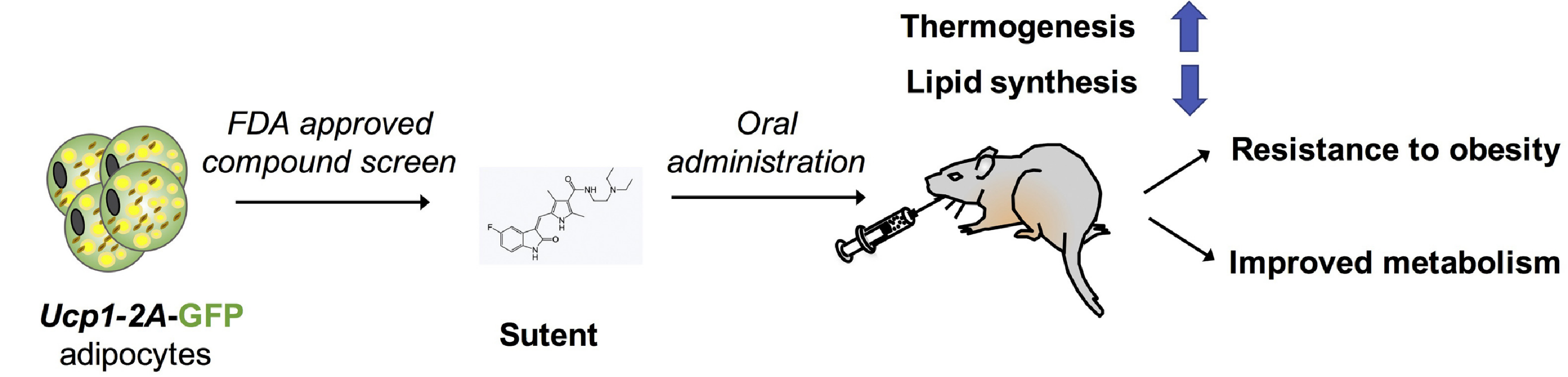 圖注:我們通過Ucp1-GFP脂肪細(xì)胞株篩選一個(gè)小分子化合物庫,發(fā)現(xiàn)一個(gè)可以顯著促進(jìn)UCP1表達(dá)的藥物——索坦(Sutent),利用小鼠模式動(dòng)物,通過體外和體內(nèi)驗(yàn)證,索坦可以促進(jìn)機(jī)體非顫抖性產(chǎn)熱和抑制脂質(zhì)合成從而抵抗由高脂飲食誘導(dǎo)的肥胖,并改善機(jī)體代謝。