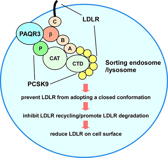 圖示:PAQR3調控LDLR-PCSK9相互作用的模式圖