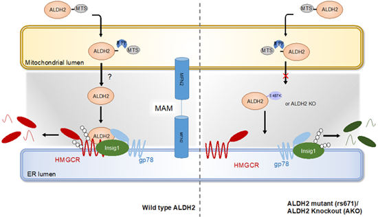 在本研究中,研究人員首先在ALDH2基因敲除以及rs671敲入小鼠中觀察到即使喂養普通食物也引起肝臟和血清中總膽固醇和低密度脂蛋白水平的升高。接著,利用代謝組學和代謝流分析發現ALDH2基因敲除小鼠膽固醇合成增加;小鼠膽固醇水平的升高可以被他汀類藥物抑制,提示ALDH2可能參與調控膽固醇合成酶HMGCR。在細胞實驗中, 研究人員發現ALDH2直接影響HMGCR的泛素化降解:ALDH2促進HMGCR與Insig1/SCAP/gp78的相互作用,抑制膽固醇合成,這種作用在ALDH2突變體中顯著減弱。進一步的機制研究顯示,在膽固醇升高時,線粒體的ALDH2通過線粒體與內質網接觸的膜結構(Mitochondria-Associated membrane with ER, MAM)轉移至內質網,促進HMGCR的泛素化降解。在ALDH2基因敲除或者rs671敲入模型中,HMGCR的蛋白穩定性增加從而促進膽固醇合成(如圖所示)。該研究發現了一個膽固醇代謝調控的新機制,同時提示在ALDH2突變人群心血管疾病的風險增加可能與膽固醇代謝失調有關;臨床降膽固醇藥物他汀可以有效抑制膽固醇水平的升高。