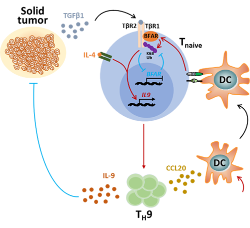 BFAR靶向TGFβ信號(hào)通路調(diào)控TH9的分化及其介導(dǎo)的抗腫瘤免疫反應(yīng)機(jī)制示意圖