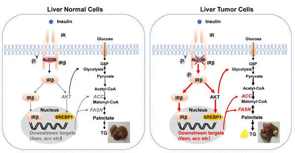 糖脂代謝是機體與細胞獲取能量和物質來源的重要生物過程。胰島素及其信號通路作為調控糖脂代謝最為重要的環節之一,該信號通路的失調可能引起糖脂代謝穩態失衡,進而引發糖尿病、脂肪肝、心血管疾病以及多種癌癥等。肝癌是臨床上常見的惡性腫瘤之一,其發生率和死亡率在世界范圍內分別高居所有癌癥的第六位和第四位。我國肝癌發病人數約占全球新發病率的一半以上,死亡率僅次于肺癌和胃癌。既往研究發現在多種腫瘤發生發展過程中,胰島素信號通路與脂肪酸合成均顯著上調。更為有趣的是本實驗室前期研究發現在肝癌中ALDOB下調,其表達水平與肝癌病人預后密切相關。因此,研究胰島素信號通路對糖脂代謝的調控機制及其在肝癌發病過程中的重要性不言而喻。