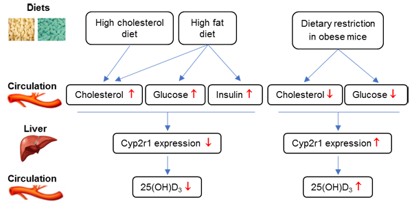 在該項(xiàng)研究中,研究者首先利用高脂、高膽固醇飲食誘導(dǎo)的肥胖及糖脂代謝紊亂小鼠模型結(jié)合體外實(shí)驗(yàn)探討維生素D缺乏發(fā)生的原因及機(jī)制。結(jié)果表明,與正常飲食小鼠相比,高脂飲食誘導(dǎo)的肥胖/胰島素抵抗小鼠出現(xiàn)血清25(OH)D3、1,25(OH)2D3顯著降低;肝臟Cyp2r1表達(dá)顯著降低;而腎臟Cyp27b1和Cyp24表達(dá)無顯著變化。在高脂飲食導(dǎo)致肥胖的過程中,血液中先后出現(xiàn)膽固醇、甘油三酯、脂肪酸、葡萄糖和胰島素水平升高。這些變化發(fā)生在肝臟Cyp2r1表達(dá)降低及血液25(OH)D3濃度降低之前。在高脂高糖飲食誘導(dǎo)的肥胖小鼠,肝臟Cyp2r1表達(dá)也顯著低于正常飲食小鼠。在高膽固醇飲食小鼠,2天后就出現(xiàn)血液膽固醇水平顯著升高,肝臟Cyp2r1表達(dá)顯著降低,這些變化都發(fā)生在血液25(OH)D3濃度降低之前。進(jìn)一步的體外實(shí)驗(yàn)發(fā)現(xiàn)高濃度膽固醇、葡萄糖、胰島素單獨(dú)能抑制小鼠肝細(xì)胞Cyp2r1表達(dá),脂肪酸則對(duì)Cyp2r1表達(dá)無顯著影響。這些結(jié)果提示高脂飲食誘導(dǎo)的肥胖小鼠中血液膽固醇、血糖、胰島素升高,以及高膽固醇飲食導(dǎo)致的小鼠血液膽固醇升高,都能通過下調(diào)肝臟Cyp2r1水平,使肝臟25(OH)D合成減少,導(dǎo)致血液25(OH)D水平降低。