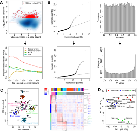 圖:(A) HyperChIP模型以校正了均值-方差關系的標度方差(scaled variance)為統計指標, 使不同信號強度水平的基因組區域之間的信號差異水平更加可比。(B)通過引入區域篩選和縮尾處理等手段來控制潛藏真陽性對參數估計的影響,顯著改善了HVR識別的統計功效。(C)將HyperChIP應用于TCGA pan-cancer ATAC-seq數據集,基于所得HVRs將部分組織來源或細胞形態相近的樣本歸類定義為四個癌癥超類型(super class),即腦部腫瘤(Brain cancer)、腎癌(Kidney carcinoma)、消化道腺癌(Digestive adenocarcinoma)和鱗狀細胞癌(Squamous cell carcinoma);下游的轉錄因子活性打分分析,發現了大量被每個超家族中腫瘤樣本所共有的轉錄調控因子。(D)比較十余個不同人類個體的淋巴母細胞系CTCF ChIP-seq數據,發現基于所得HVRs能很好地區分不同種群個體的樣本。