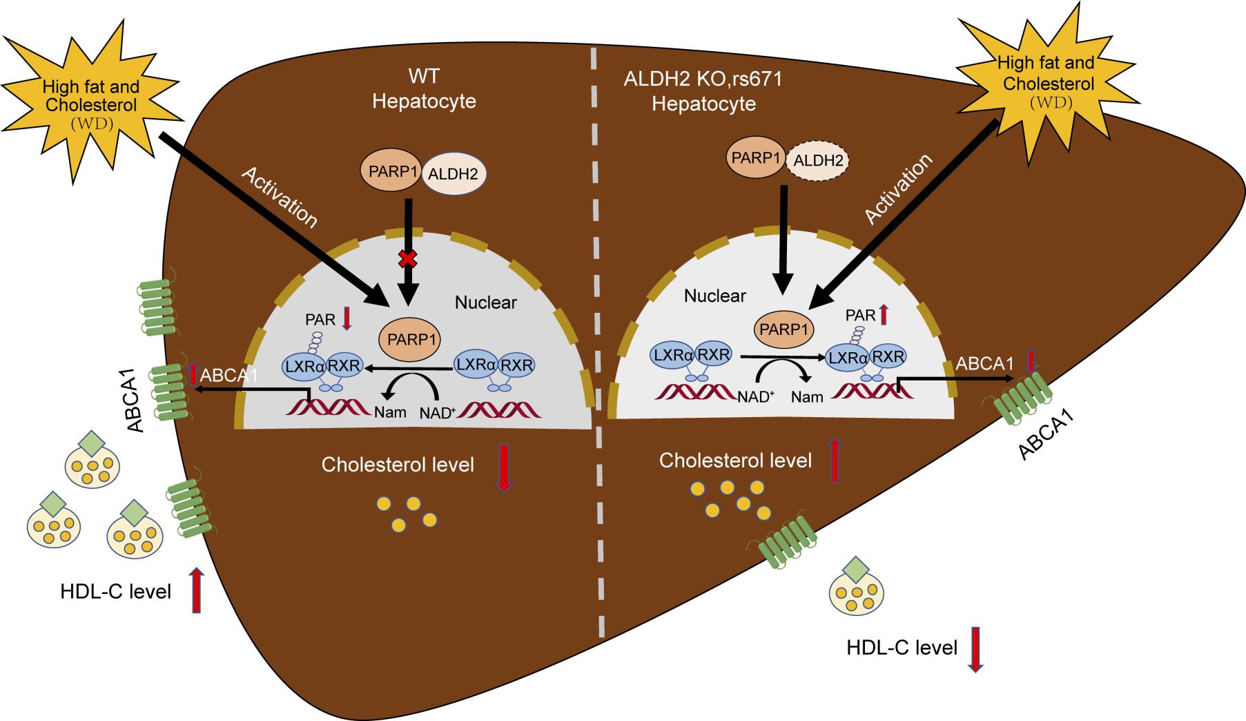 在本項目中,研究人員發現給予西方飲食的ALDH2敲除,ALDH2/LDLR雙敲,和ALDH2 rs671敲入的小鼠血漿HDL-C顯著下降,但肝臟膽固醇水平與脂質堆積增加,肝臟膽固醇外排生成HDL-C的重要蛋白ABCA1下調表達,提示肝臟ALDH2在調控HDL代謝中發揮重要作用。接著,利用非靶向高分辨質譜代謝組學發現ALDH2/LDLR雙敲小鼠與LDLR敲除小鼠相比,在給予西方飲食時血清中腺苷二磷酸核糖(ADP-Ribose)水平顯著升高,提示PARP1通路可能參與其中。進一步的機制研究發現:ALDH2與PARP1的入核序列結合抑制PARP1的入核,使其對LXRα的聚(ADP-核糖基)化下降,從而促進ABCA1的表達,最終增加肝臟膽固醇的外排與生成HDL。相反,ALDH2的敲除或者突變解除降低了其對PARP1入核的抑制,使LXRα的聚(ADP-核糖基)化增加,抑制ABCA1的表達,減少肝臟膽固醇的外排,從而造成血液HDL-C水平下降。PARP1的抑制劑PJ34在ALDH2敲除小鼠中可以逆轉由于西方飲食引起的肝臟脂質堆積,增加ABCA1表達,升高血液HDL-C水平。結合前期的研究,在人肝臟組織中由于ALDH2 rs671突變促進其降解,造成蛋白水平降低,同樣減少ALDH2對PARP1入核的抑制,增加LXRα的聚(ADP-核糖基)化,從而降低ABCA1的表達和肝臟膽固醇向血漿中的外排與HDL的生成。