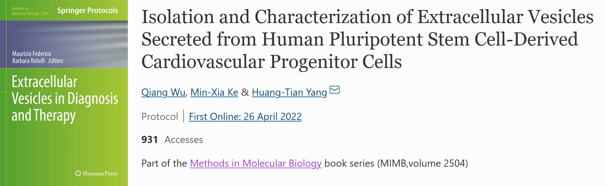 2022年4月26日,Springer Nature出版的Methods in Molecular Biology系列叢書Extracellular Vesicles in Diagnosis and Therapy在線發表了中國科學院上海營養與健康研究所楊黃恬研究組題為“Isolation and Characterization of Extracellular Vesicles Secreted from Human Pluripotent Stem Cell-Derived Cardiovascular Progenitor Cells”的工作。該工作介紹了從人多能干細胞源心血管前體細胞(hPSC-CVPCs)條件培養基中高效分離細胞外囊泡(EVs)及其特征鑒定的方法。