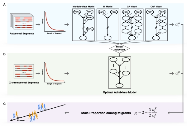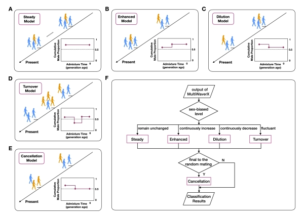 性別偏向性實際上廣泛存在于人群基因交流過程中,即特定祖源的男女遺傳貢獻(xiàn)存在差異。非裔美國人(African Americans)和拉丁裔美洲人(Hispanic Americans or Latino American)為學(xué)界熟知的存在性別偏向性混合的人群。性別偏向性混合的研究對了解人群形成和演化歷程、理解現(xiàn)代人類遺傳差異、以及指導(dǎo)醫(yī)學(xué)研究都有重要的理論意義和應(yīng)用價值。然而,受限于分析方法,人群演化歷史上錯綜復(fù)雜的基因交流中存在的性別偏向性長期以來未得到充分研究,特別是一些經(jīng)歷過多次而復(fù)雜基因交流歷史的人群,曾經(jīng)發(fā)生的不同方向的性別偏向混合往往被忽視。MultiWaverX的提出在很大程度上為這些問題的解決提供了新方法和新思路。