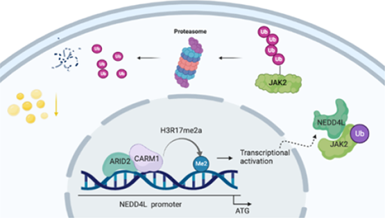 該研究發現,Arid2肝臟特異性敲除的小鼠在正常飲食下7個月時會自發產生肝臟脂肪變性,高脂飲食則會加劇這一進程。研究人員進一步探索了其中的機理并揭示ARID2通過負調控JAK2-STAT5-PPARγ影響了肝臟脂質代謝。機制研究發現,ARID2通過上調E3連接酶NEDD4L的轉錄從而促進JAK2的泛素化。ARID2招募CARM1到NEDD4L的啟動子區域,增加該區域組蛋白H3第17位精氨酸的不對稱雙甲基化(H3R17me2a)從而促進其轉錄。此外,在Arid2肝臟特異性敲除的小鼠中,JAK2的抑制劑Fedratinib能夠有效的緩解高脂飲食誘導的肝臟脂肪變性。在商業購得的NAFLD病人的肝臟樣本中,研究人員檢測到了較低的ARID2蛋白水平并且驗證了ARID2與JAK2的負相關性。綜上所述,該研究揭示了ARID2在維護肝臟脂質穩態中的重要作用,并為ARID2缺失的NAFLD患者提供了有效的治療策略參考。