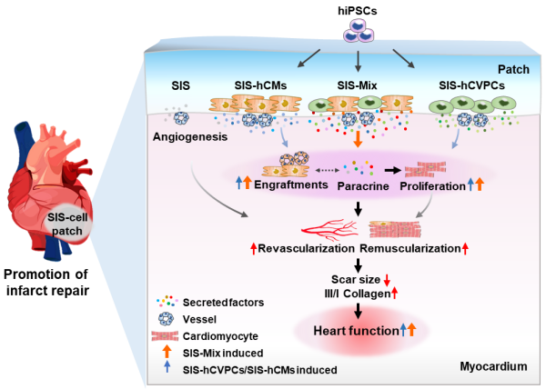 心肌梗死(心梗, MI)死亡是疾病致死的主要原因,其死亡率在我國呈逐年上升趨勢,嚴重危害國人健康。心梗后大量死亡的心肌細胞被纖維瘢痕替代,進而導(dǎo)致心力衰竭。現(xiàn)有治療方法難以逆轉(zhuǎn)心梗后心肌細胞大量死亡和纖維瘢痕形成導(dǎo)致的心力衰竭,因此,亟需發(fā)展改善心肌細胞減容、促進梗死心臟組織和功能重建的方法。基于hPSCs衍生心血管細胞的移植治療的探索顯示了其應(yīng)用前景。楊黃恬研究組和其他研究團隊的工作證實hCVPCs和hCMs移植到小鼠、豬及非人靈長類動物梗死心臟中可顯著改善心功能,減少纖維化,但仍面臨hCVPCs駐留率低、心肌內(nèi)注射hCMs發(fā)生室性心律失常等難題。因此,如何提高移植細胞駐留、療效與安全性,明確適宜的移植細胞類型和作用機制對細胞治療走向臨床至關(guān)重要。脫細胞豬小腸粘膜下層細胞外基質(zhì)材料(SIS)具有優(yōu)越的生物相容性,支持干細胞附著和生長,在心梗后移植可促進血管生成和心功能恢復(fù),但尚不清楚其是否可用于構(gòu)建hPSCs衍生心血管細胞的補片。