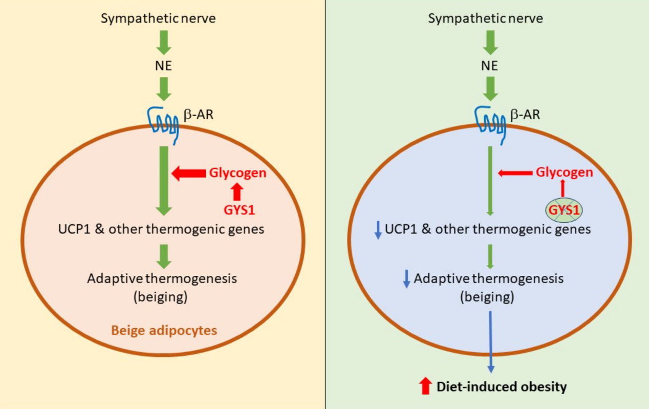 糖原是葡萄糖殘基的分支聚合物。糖原的代謝包括糖原的合成和降解,主要受激素以及糖原合成酶(GS)和糖原磷酸化酶(GP)兩種關(guān)鍵酶的控制。GS通過催化α-1-4糖苷鍵的形成,在糖原鏈上添加新的葡萄糖,在糖原合成的最后一步中起著關(guān)鍵作用。在哺乳動物中,GS有兩種亞型:GYS1和GYS2,分別由Gys1和Gys2基因編碼。Gys2僅在肝臟中發(fā)現(xiàn),而Gys1在許多不同的組織中表達(dá),如肌肉和脂肪。盡管與肌肉和肝臟相比,脂肪細(xì)胞中的糖原水平較低,但近年來人們開始認(rèn)識到它在調(diào)節(jié)糖脂代謝協(xié)調(diào)中的重要性。脂肪細(xì)胞的適應(yīng)性產(chǎn)熱因其在對抗肥胖方面的潛在應(yīng)用而成為近年來研究的熱點。當(dāng)受到冷暴露或兒茶酚胺刺激時,β3腎上腺素能受體被激活,進(jìn)而導(dǎo)致下游cAMP-PKA信號轉(zhuǎn)導(dǎo)和UCP1表達(dá)激活,從而增加能量消耗。