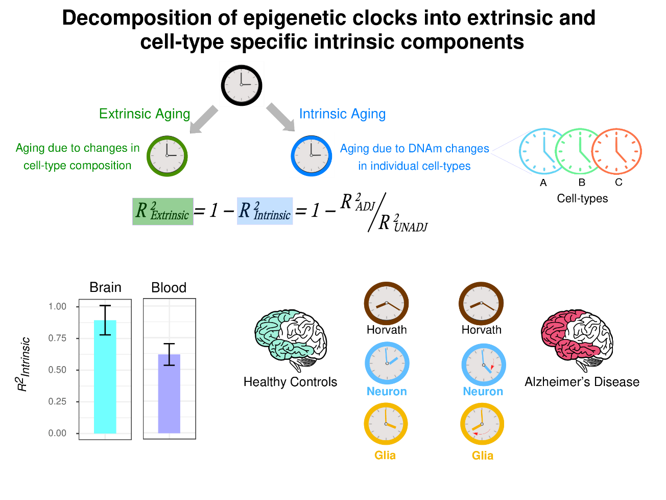 表觀遺傳時鐘是用于測量實際年齡和生物年齡的一種機器學習預測器,在許多科研領域得到廣泛應用,可用于監(jiān)測健康衰老或檢驗抗衰老干預措施在人體和動物模型中的功效。然而,表觀遺傳時鐘的構建和解讀的一大挑戰(zhàn),是復雜組織中潛在的細胞類型異質性,因為這些組織的細胞類型組成會隨著年齡發(fā)生變化。當前的表觀遺傳時鐘是由兩個過程組成的復合體:一個“外在”過程捕捉細胞類型組成的年齡相關變化,另一個“內在”過程捕捉發(fā)生在單個細胞類型中的年齡相關表觀遺傳(DNA 甲基化)變化。目前尚不清楚表觀遺傳時鐘的準確性,有多少歸因于這些不同的外在和內在衰老過程。此外,如何將“內在”過程量化為單個細胞類型的衰老過程也尚不清楚。因此,有待提出一種在細胞類型分辨率上量化生物衰老的方法。