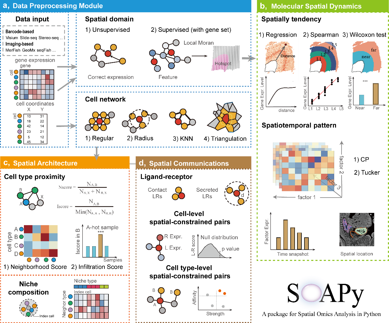 圖:面向空間組學的微環境解析工具包SOAPy,包括預處理、空間分子動力學、空間結構和空間通訊四個模塊。