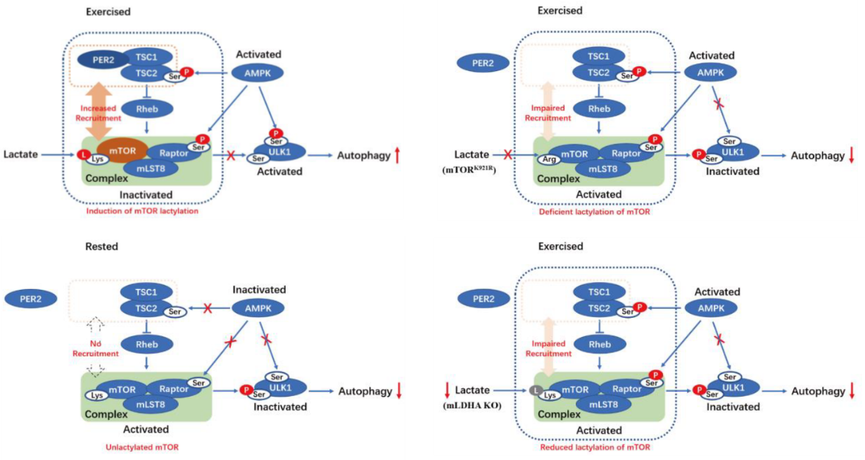 通過該項(xiàng)研究,研究團(tuán)隊(duì)提出以下工作假說(見下圖):運(yùn)動導(dǎo)致骨骼肌乳酸迅速升高;升高的乳酸直接乳酸化修飾mTOR蛋白的K921位點(diǎn);此修飾協(xié)同AMPK的激活,共同抑制mTORC1活性;mTORC1的抑制進(jìn)而解除其對自噬啟動的剎車作用,最終激活自噬,清理受損細(xì)胞器,維持肌肉健康。