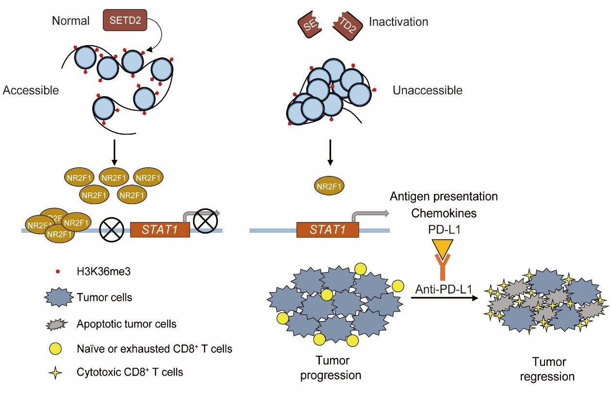 (左):SETD2正常發揮作用,染色質開放性強,NR2F1表達水平高,抑制STAT1轉錄激活。(右):SETD2失活時染色質開放性差,NR2F1表達水平低,STAT1轉錄增強。重塑腫瘤免疫微環境,增強腫瘤細胞對免疫檢查點阻斷治療的敏感性。