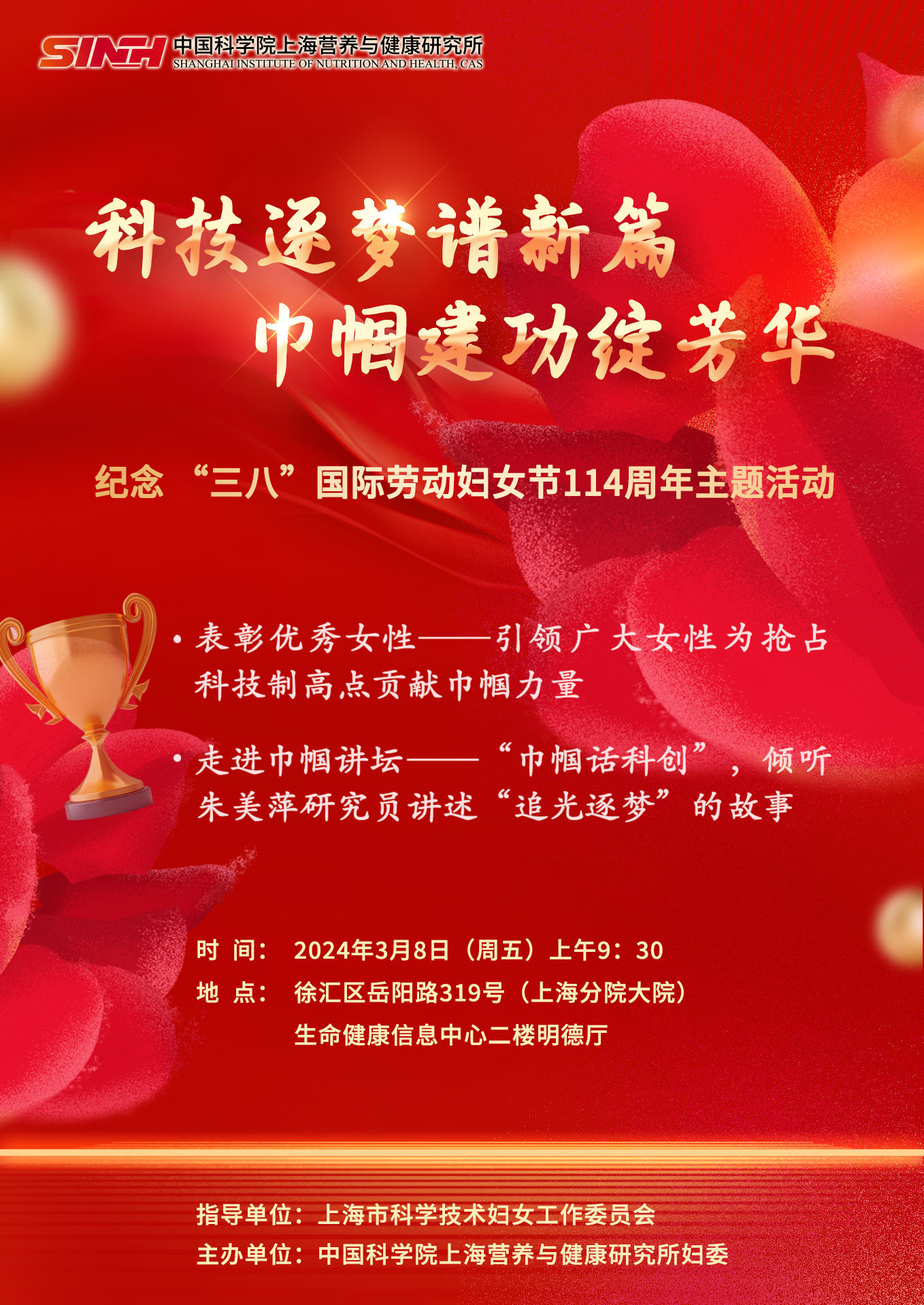 此外歡迎全所及各兄弟單位女性同胞于3月8日當天,參加“科技逐夢譜新篇?巾幗建功綻芳華”營養與健康所紀念國際勞動婦女節114周年主題活動。