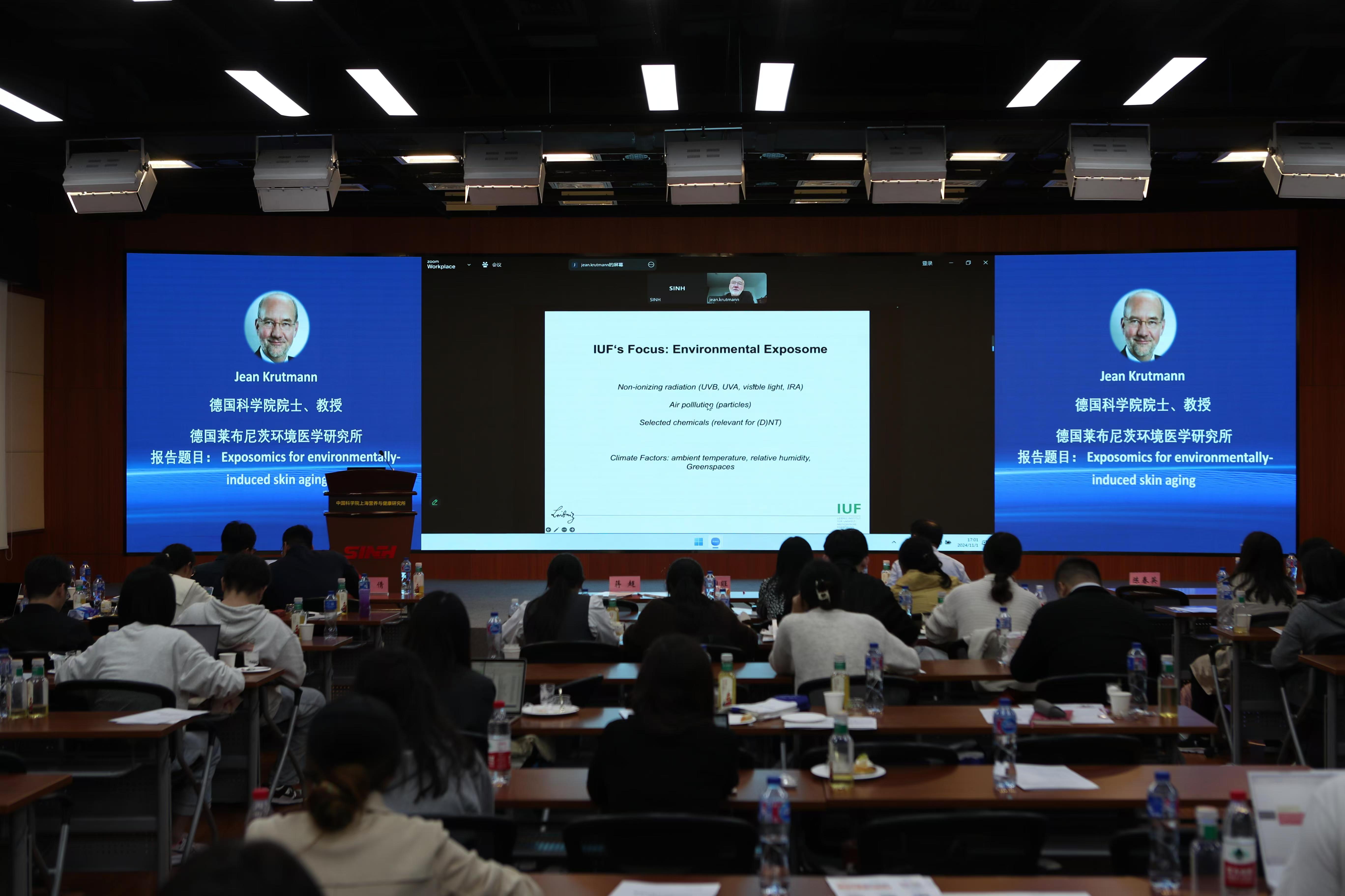 論壇特別邀請德國科學(xué)院院士、德國萊布尼茨環(huán)境研究所Jean Krutmann教授,中國科學(xué)院院士、國家納米科學(xué)中心陳春英研究員為大會嘉賓,他們分別分享了題為“Exposomics for environmentally-induced skin aging”“微納尺度環(huán)境污染物的毒理效應(yīng)”的學(xué)術(shù)報告。此外,中國科學(xué)院大連化學(xué)物理研究所許國旺研究員、福建醫(yī)科大學(xué)葉為民教授、中國科學(xué)院生態(tài)環(huán)境研究中心劉倩研究員、北京大學(xué)王斌研究員、營養(yǎng)與健康所宗耕研究員、浙江大學(xué)蔣超研究員、復(fù)旦大學(xué)方明亮教授、牛越青年研究員、營養(yǎng)與健康所李文然博士等專家學(xué)者分別就代謝水平上闡明暴露對人群的健康效應(yīng)、基于沿海精準(zhǔn)隊列的人群環(huán)境暴露組研究進(jìn)展、大氣細(xì)顆粒物的內(nèi)暴露分析與溯源情況、基于暴露組學(xué)大數(shù)據(jù)與人工智能構(gòu)建人體健康風(fēng)險評價模型環(huán)境暴露組學(xué)的研究挑戰(zhàn)與進(jìn)展、基于人群的食物攝入生物標(biāo)記研究成果、空氣精準(zhǔn)暴露組方法、實踐及挑戰(zhàn)等作了主題報告,為與會人員帶來了一場精彩紛呈的學(xué)術(shù)盛宴。大家圍繞報告內(nèi)容展開了熱烈且深入的交流討論,現(xiàn)場學(xué)術(shù)氛圍濃厚,思想碰撞激烈。