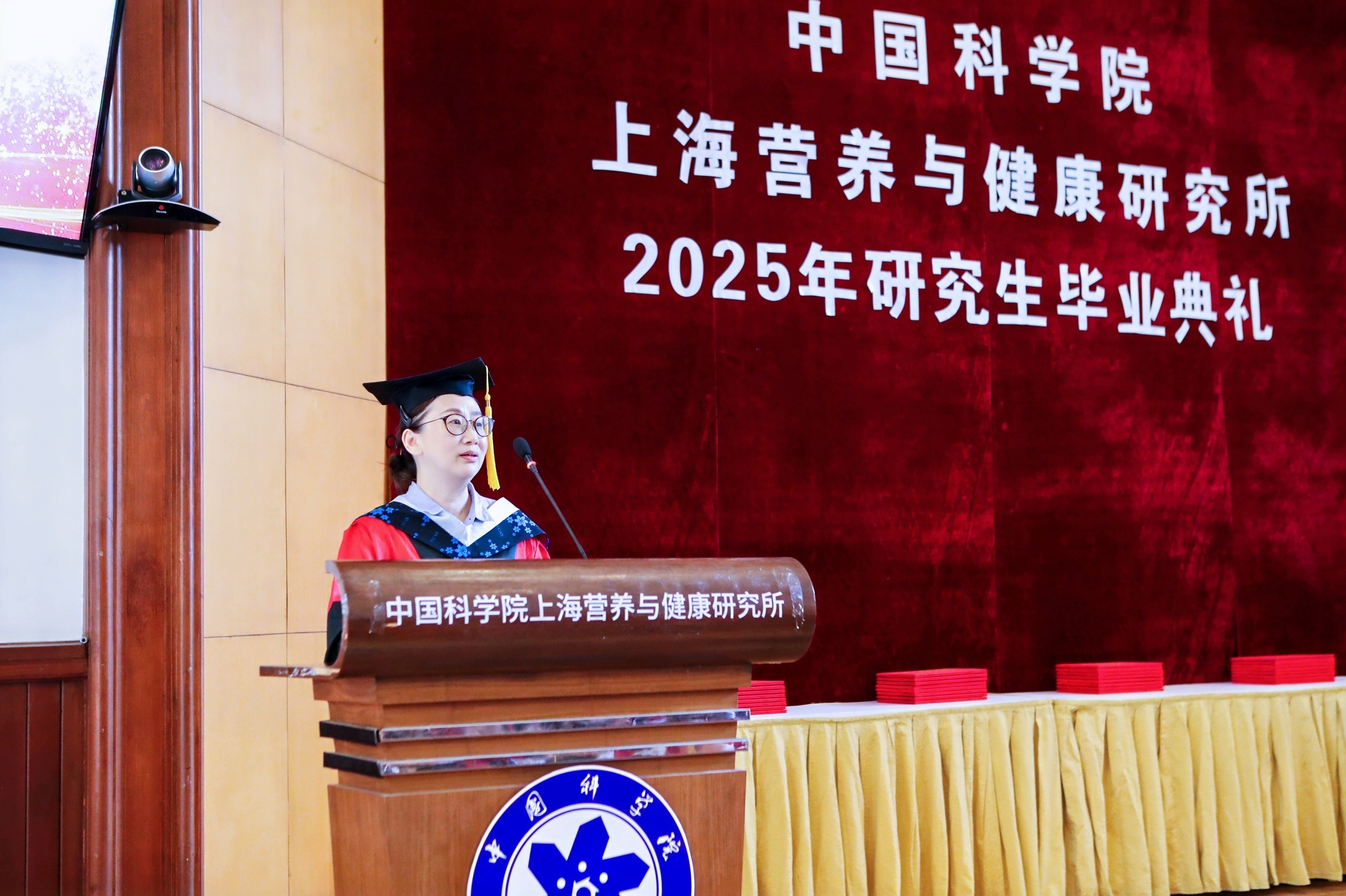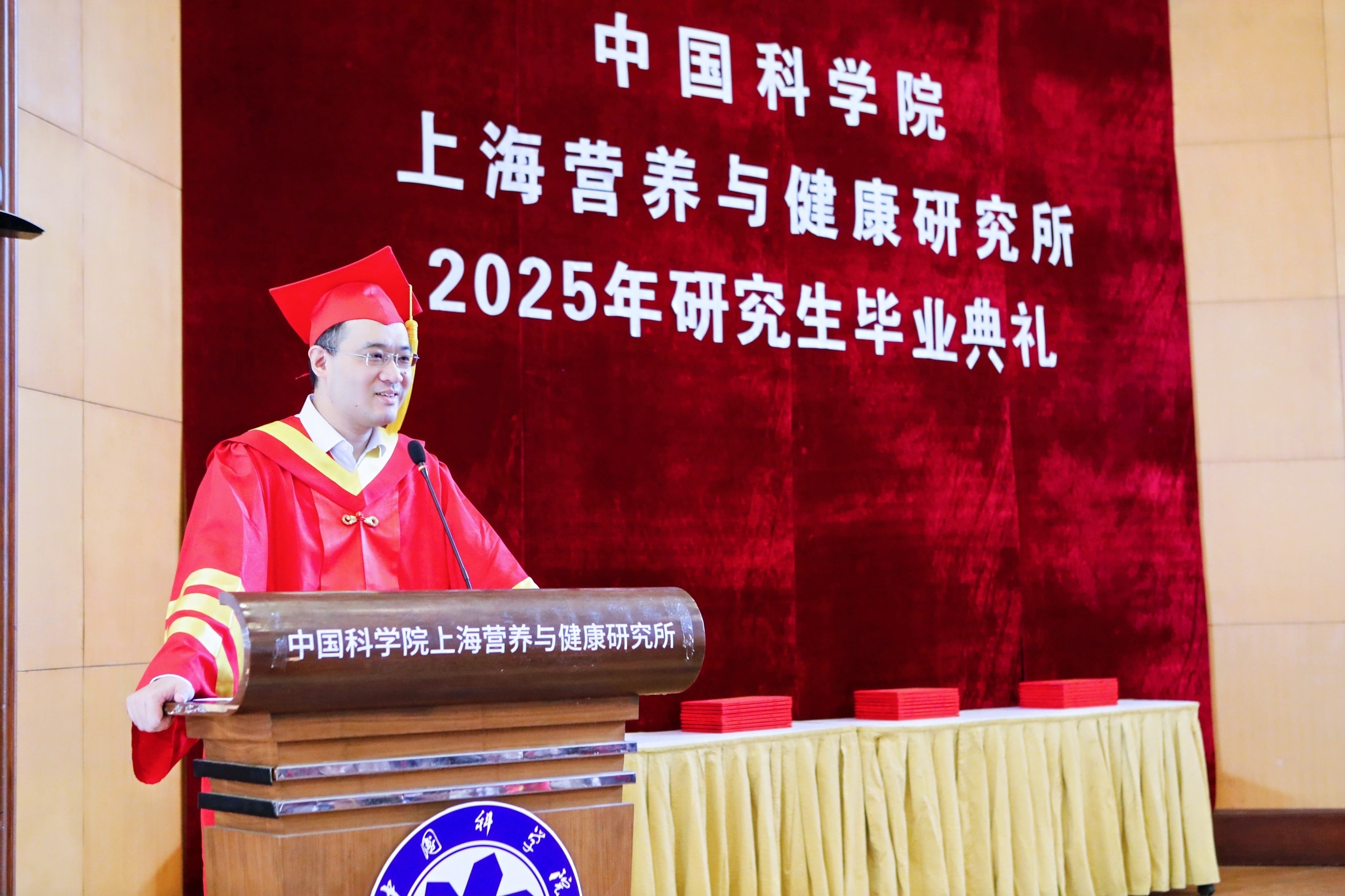 6月20日,中國科學院上海營養與健康研究所2025年研究生畢業典禮在生科大樓報告廳舉行。營養與健康所所長、黨委副書記汪思佳,副所長、學位評定委員會主席胡國宏,所務委員、學位評定委員會副主席邵振,學位評定委員會委員孔祥銀、王躍祥,導師代表熊燕、黃濤、王振,2025屆畢業生與畢業生親友、研究生處教育管理干部等100余人齊聚一堂,共同參與了這一盛典。畢業典禮由邵振主持。